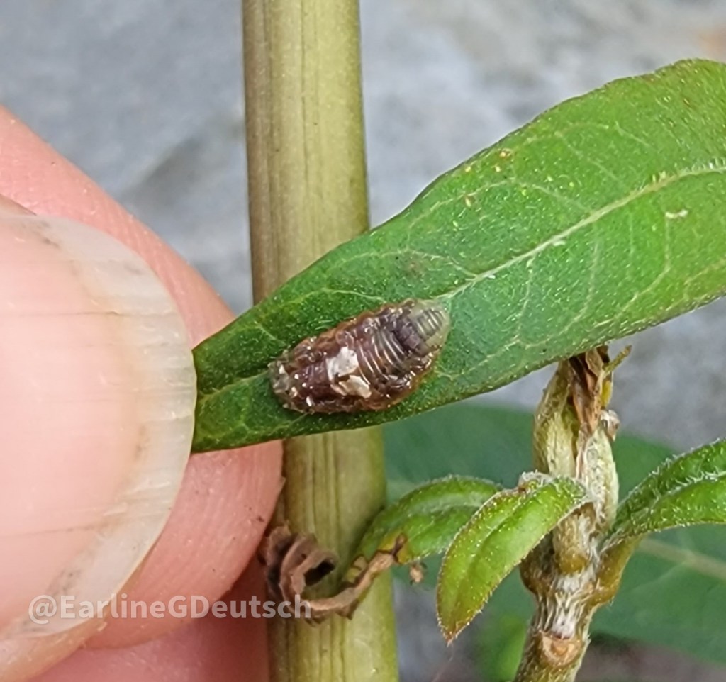 Today I found two larvae on the milkweed, one of which I know, and the other I don’t. First, the Dusky-winged hover fly has appeared again. It’s not the prettiest. A few weeks ago I had mistaken it for excrement, but I know that some swallowtail butterflies have ugly larvae akin to bird poop. Swallowtails do not lay eggs on milkweed though. So I consulted others on iNaturalist. The knowledgeable folks there said it was a syrphid of some sort, and most agreed on the dusky-winged hover fly. I put the plant in my butterfly tent and a few days later, poof, larvae was gone a pretty fly showed up. Question answered.
