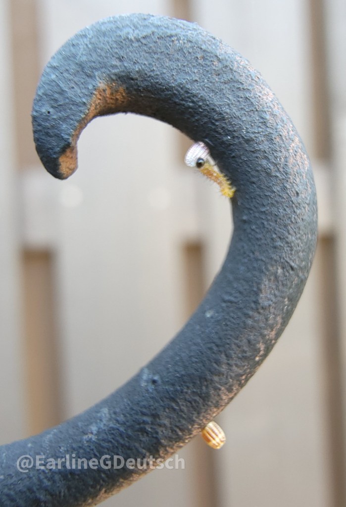 I noticed an anxious looking Gulf Fritillary female, fluttering about seeking a spot to posit her eggs. I guess she didn’t like the passion vine I had planted specifically for her, so she decided a metal trellis would be a better place to lay her eggs. I watched the eggs for a day or so, and noticed one hatching.