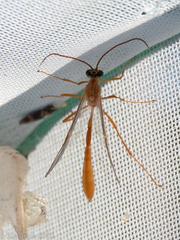 The beetle on the left is some kind of Shining Leaf Chafer, Tribe Anomalini. This is a type of scarab beetle. I’m no beetle expert, so I don’t know the exact species. And the adorable, albeit funny looking wasp on the right is an Ichneumonidae. I also don’t know the exact species, but I see them almost every night that I leave out my moth trap.